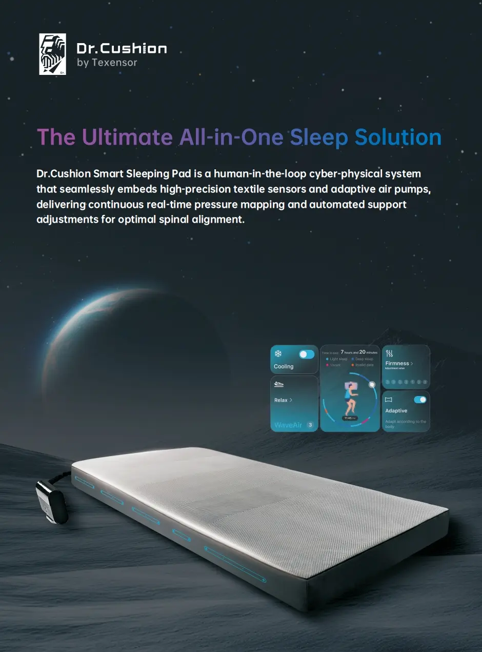 Dr.Cushion Smart Sleeping Pad is a human-in-the-loop cyber-physical system that seamlessly embeds high-precision textile sensors and adaptive air pumps, delivering continuous real-time pressure mapping and automated support adjustments for optimal spinal alignment.